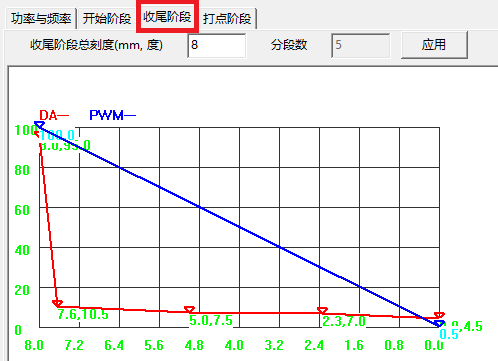 光纖激光的功率用0~10V電壓(或者0~4V)控制,但當(dāng)DA電壓增大或者減小時(shí),功率不能立即增大或減小,當(dāng)焊接收尾關(guān)激光時(shí),如果激光功率很大時(shí)突然關(guān)光,收尾處會(huì)出現(xiàn)一個(gè)小坑。解決這一問題的辦法:增加收尾段的長度(一般設(shè)置8~10mm),拉低收尾段DA和PWM曲線,使激光功率降低后再關(guān)激光。圖1為收尾段激光功率緩降波形設(shè)置,其中紅線為DA電壓,藍(lán)線為PWM占空比。圖a 正確設(shè)置; b 電壓下降太快,造成收尾段沒有激光,收尾前有坑;c 電壓下降太慢,激光功率降不下來,收尾有坑。