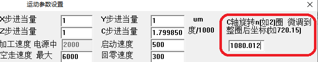 4 將該實(shí)際角度值填入?yún)?shù)設(shè)置的“C軸旋轉(zhuǎn)n圈 微調(diào)到整圈后的坐標(biāo)值”, 軟件會(huì)自動(dòng)精確計(jì)算C軸的脈沖當(dāng)量。旋轉(zhuǎn)圈數(shù)越多,精度越高。