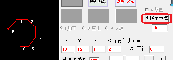 如果示教生成的零件加工程序還有偏差,可以再點(diǎn)示教編程進(jìn)去修正軌跡,進(jìn)入后,只能點(diǎn)“移動(dòng)至節(jié)點(diǎn)”,可以一點(diǎn)一點(diǎn)按順序移動(dòng),也可以輸入節(jié)點(diǎn)號(hào),直接移動(dòng)到節(jié)點(diǎn)N。移動(dòng)到各節(jié)點(diǎn)后,再手動(dòng)移動(dòng)工作臺(tái)到準(zhǔn)確位置,然后再點(diǎn)“移動(dòng)至節(jié)點(diǎn)”往后移動(dòng)。校準(zhǔn)后點(diǎn)結(jié)束就可以了。